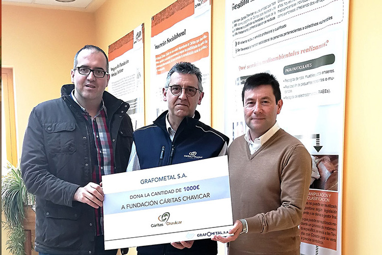 Por tercer año consecutivo, Grafometal apoya la labor social de Fundación Cáritas Chavicar realizando un donativo de mil euros. La empresa riojana, referente en Europa en impresión UV sobre hojalata, ha entregado esta aportación a Jesús Pablo Romero, director gerente de la Fundación, durante una visita a las instalaciones de la entidad en el polígono El Carrascal.
